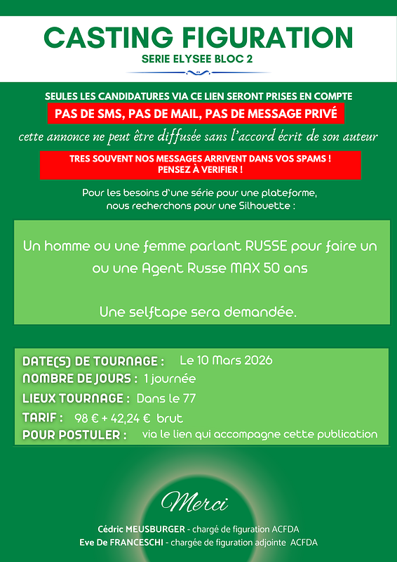 Cachet : Rôles : 304,99€ bruts/jours (quelques rôles un peu plus important pourraient avoir une rémunération supérieure)