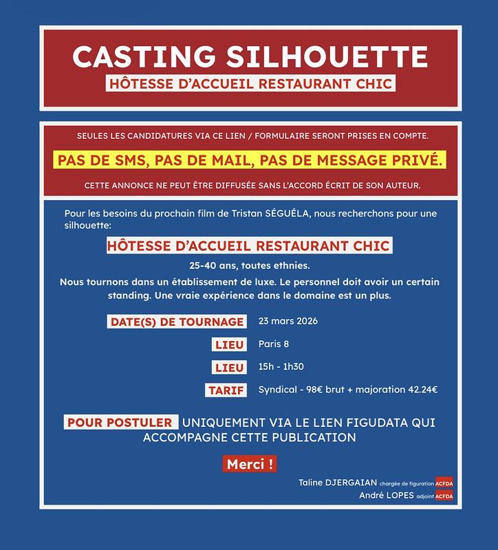 ATTENTION, merci de postuler UNIQUEMENT (LES 3 PHOTOS) avec des PHOTOS EN TENUES chics, classes, que vous avez chez vous et que vous pouvez prendre sur le tournage + COIFFE/MAQUILLE d'une manière que vous pouvez reproduire vous même (pas besoin de faire des folies compliquées, sobre et chic c'est bien mais pas de photos de shooting ou pro quoi, on a pas besoin de qualité de photo ne vous inquiétez, au téléphone ça fonctionne très bien ;) )